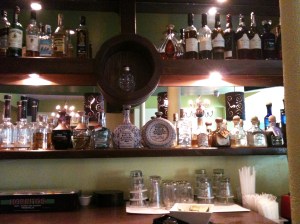 Je m’installe donc au bar. Et là, je dois dire que je suis très agréablement surprise car même si le bar est assez petit, le choix de Tequilas est vraiment large, je suis d’ailleurs ravie d’en découvrir certaines. Le bar est quant à lui assez original : à l’avant on y retrouve des citrons et des limes insérés …..