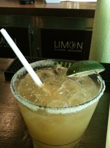 Je passe donc la commande à notre barmaid qui est très souriante: ce sera, comme prévu, une Margarita. La barmaid me demande si je préfère ma Margarita sur glace ou en sloche… je lui dis juste shaker mais pas de glace. Elle me rétorque aussitôt, qu’une Margarita se fait toujours soit avec des glaçons soit en sloche! Comme je ne veux pas l’a contrarier (elle est tellement sûre d’elle), je lui répond que je vais la prendre sur glace.