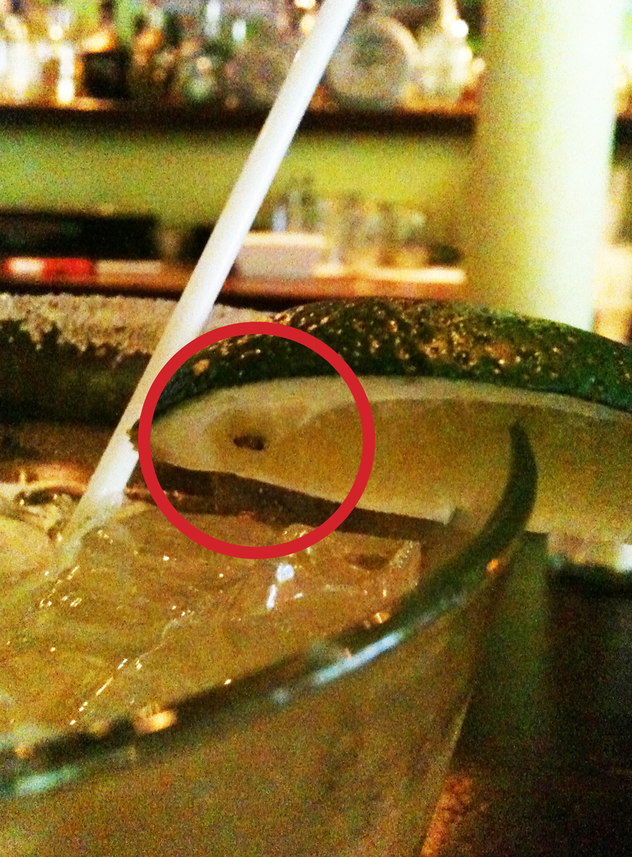 Et là……. C’est le drame! Déjà il n’y a pas de Cointreau…..mais une chance que je n’ai pas d’ulcère à l’estomac car même s’il y a du sucre dans le cocktail, le jus de lime est tellement acidulé que la Margarita en est tout carrément imbuvable!!!!! De plus pour gagner du temps le givrage de sel fin de leurs verres est déjà préparé à l’avance….. Mais le ‘’ high light ‘’ de ma soirée, c’est au moment de prendre ma première gorgée, je vois une très jolie bibite à fruits qui est sur ma lime… Wow !!!!!
