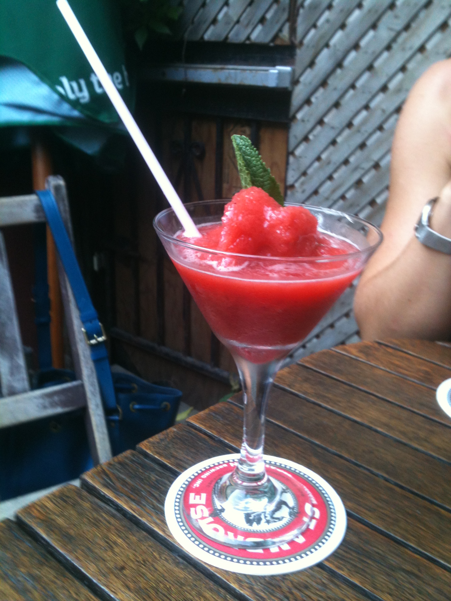 Alors quand je vois sur certaines cartes de bar un ‘’Strawberry Daiquiri ‘’ sans alcool, on vous sert quoi, du jus de lime, du sucre liquide et du jus de fraise mélangés ? Et bien oui, et il y a même certains bars qui vous le serve en sloche….. Comme au Barraca à Montréal, voyez d’ailleurs le cocktail, on dirait que l’on va tout simplement boire un sorbet à la fraise…..