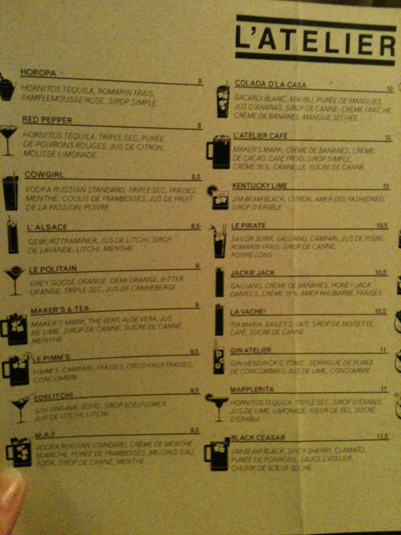 Bonsoir, de mon coté c’est ce midi que j’ai découvert L’Atelier en compagnie d’amies. Nos cocktails ont été le « colada d’la casa » « le cow girl » et le »cocktail Marie-Mai » au contraire de vous ce fut pour nous un délice et envie de recommencer bientot.. Peut être que le soir ou vous y etes allée n’était pas le bon soir puisque L’Atelier n’est ouvert que depuis 4 mois et en plus comme il débutait en affaires et que c’était la soirée de Pink Floy les serveurs ont peut etre un peu paniqués.