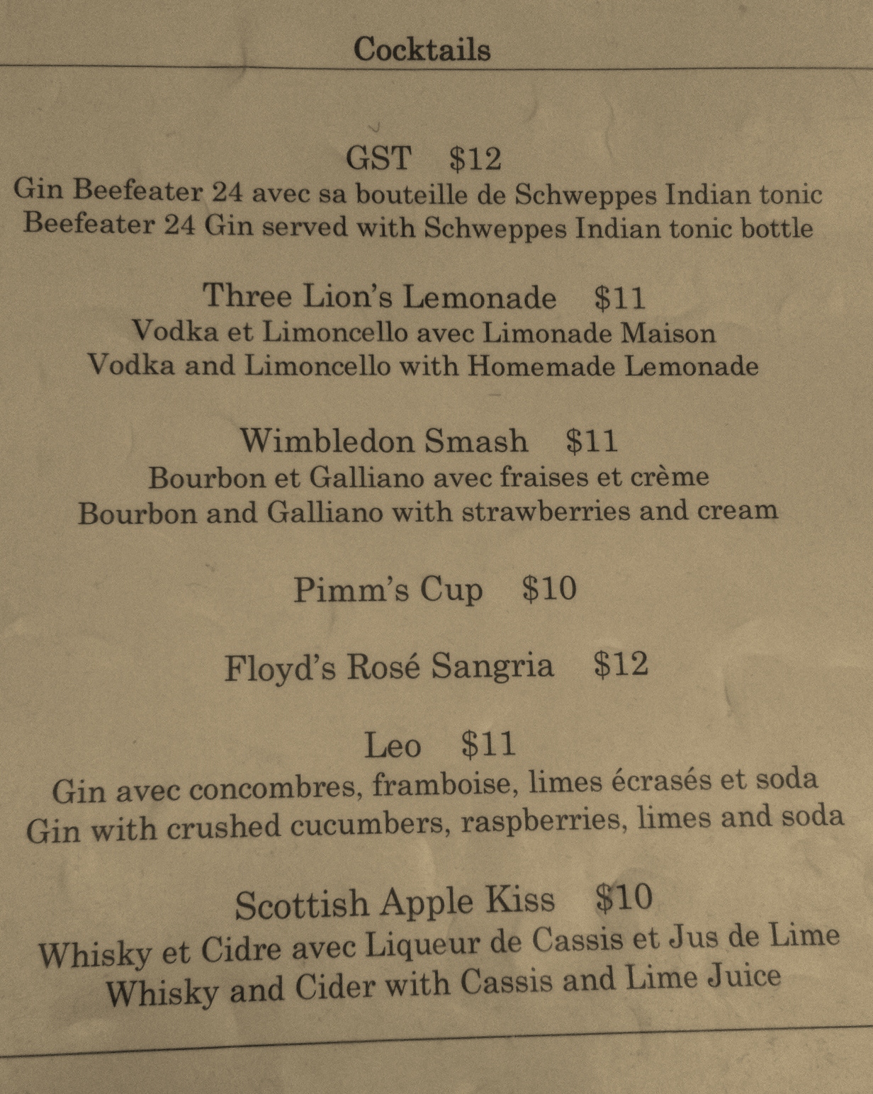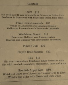 La semaine dernière je me suis rendue au Burgundy Lion, sur la rue Notre Dame, près du Marché Atwater à Montréal. Cet endroit qui a ouvert ses portes en 2008 est un peu une sorte de pub anglais mais assez chic tout de même. Saviez-vous que le mot pub est tiré du mot » Public House » qui n’était autre que l’endroit de rencontre d’un quartier et c’est exactement ce que représente le Burgundy Lion. Il n’y a qu’à regarder leur liste de bières et de whiskys qui est absolument impressionnante. De plus l’ambiance qui se dégage de cet endroit est géniale, la tenue des serveuses et barmen est : jean noir, tee-shirt blanc et bretelles noires, perso moi j’adore. On a vraiment l’impression de se retrouver dans un pub londonien juste en arrivant au Burgundy, avec le grand bar en bois, les tables rondes et les chaises en cuir capitonnées…