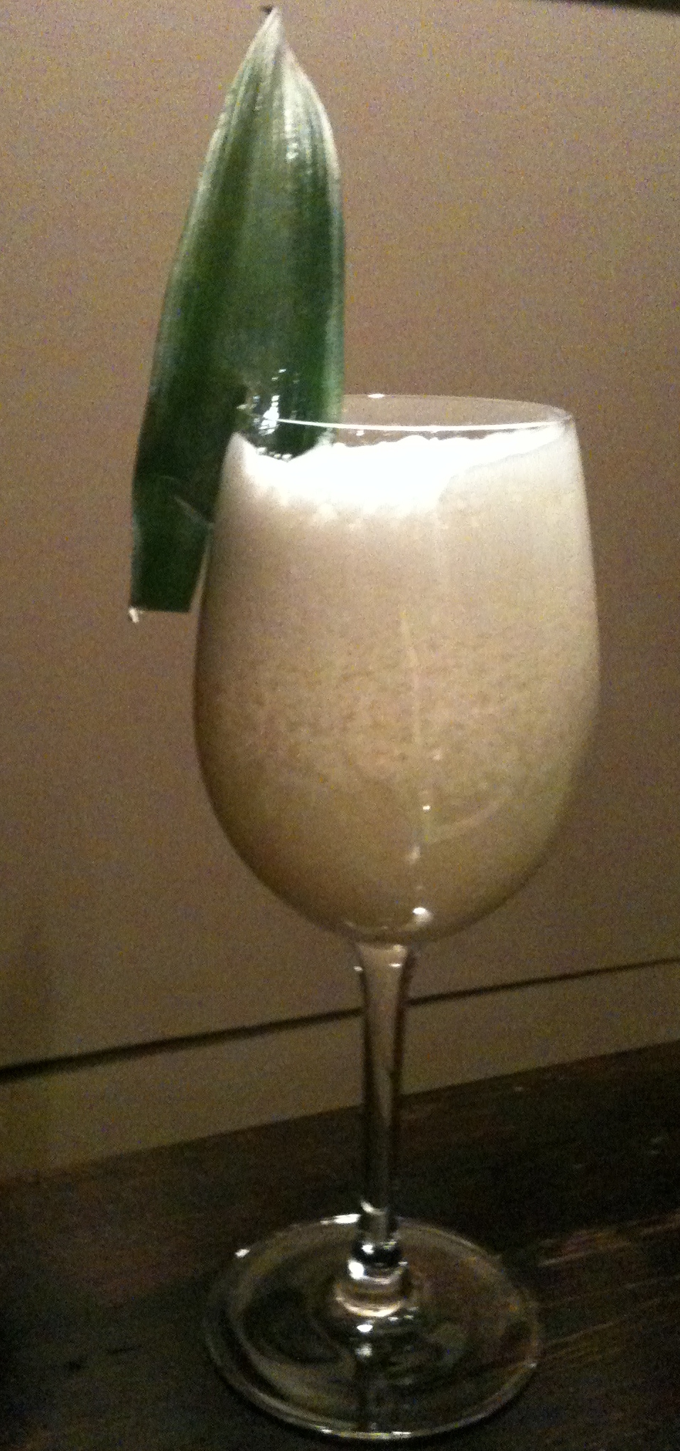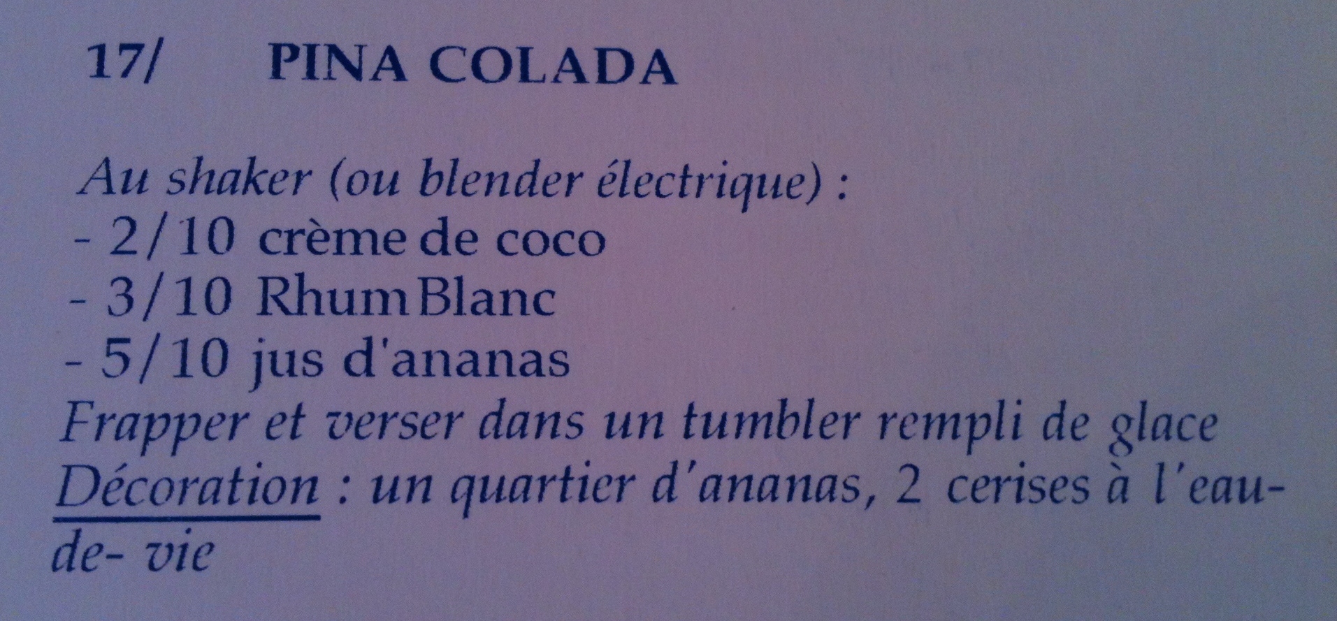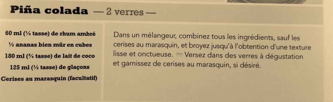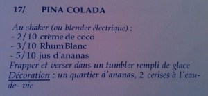 Quelle histoire! Bon voici donc notre Pina Colada après les modifications apportées… On peut enfin boire et déguster notre cocktail avec les tapas »préparés maison ». Je me penche cependant un peu plus sur la recette du livre en question…