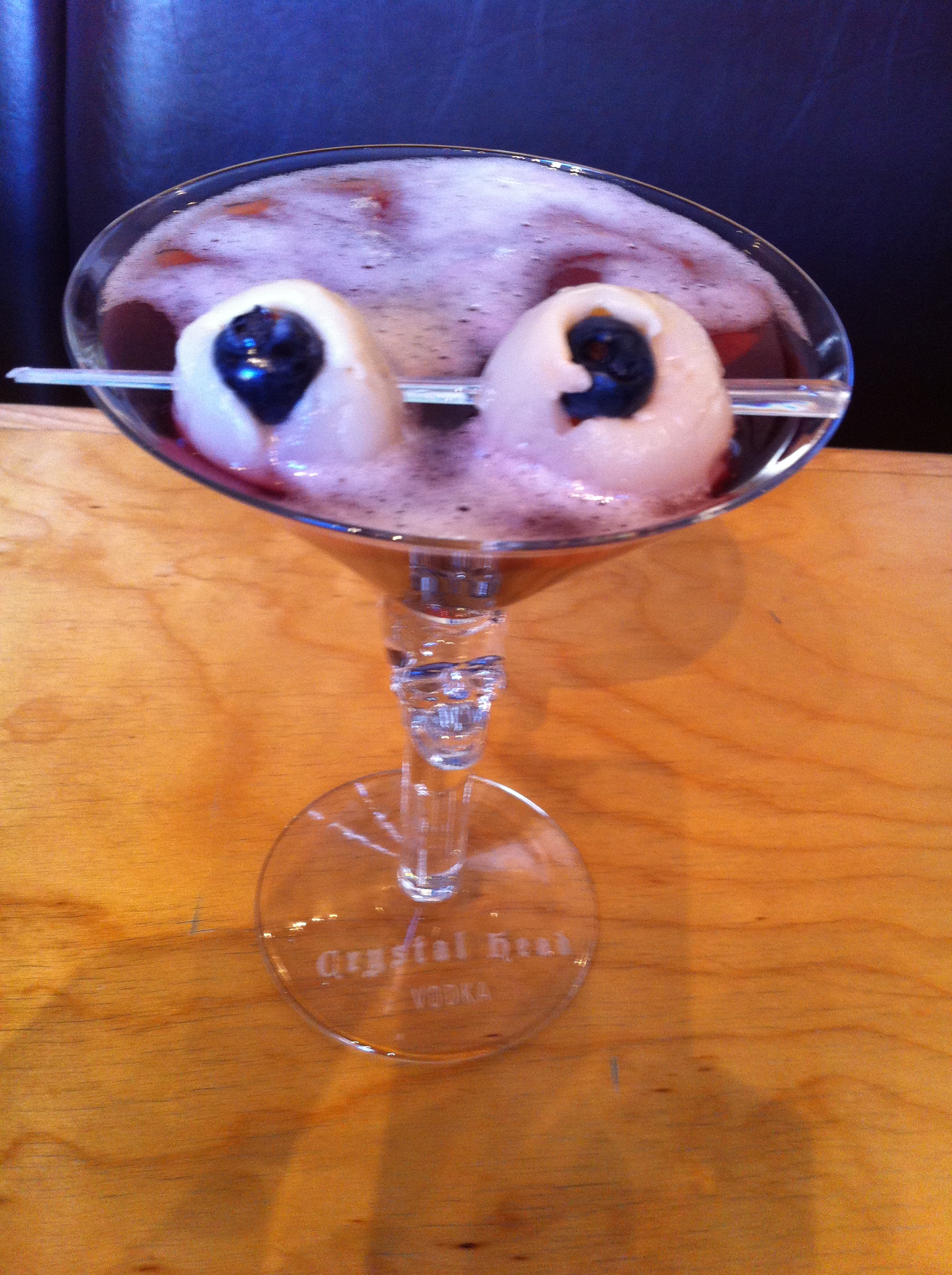Mettez 1 bleuet dans 1 litchi pour faire un œil. Faites-en 2 et faites une brochette…. Vous aurez l’impression que votre cocktail vous regarde……