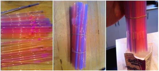 La première étape, c’est de préparer le contenant de 1l. avec des pailles étirées, que l’on met debout bien serrées ensemble. Ce sont nos moules à vers. Soit vous mettez des élastiques autour des pailles ou même à l’extérieur du contenant si vous le remplissez de pailles, ça fonctionne aussi!