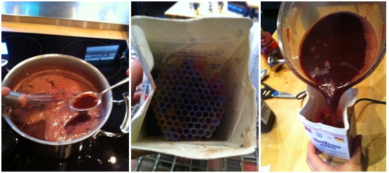 Il faut mettre le jello et la gélatine dans un bol, verser l’eau bouillante et brasser jusqu’à ce que ce soit bien dissout. Ensuite on laisse refroidir jusqu’à température pièce, on y verse la crème et le colorant alimentaire jusqu’à obtention de la couleur désirée. Ensuite on verse notre préparation dans notre contenant préparé avec les pailles. On refroidit 8 h au frigo.