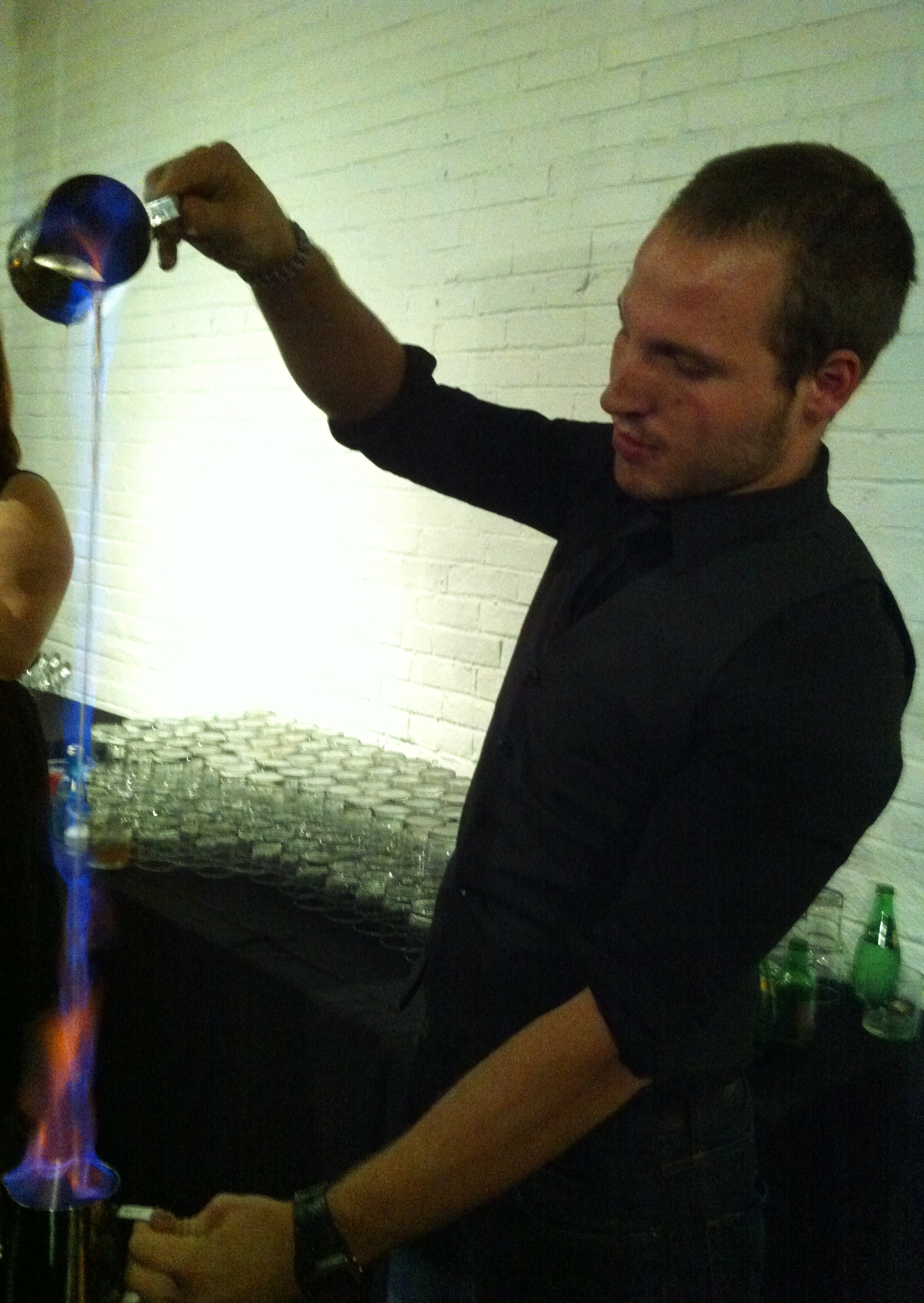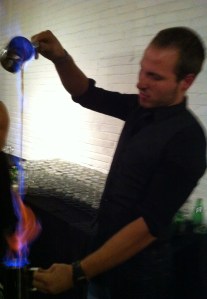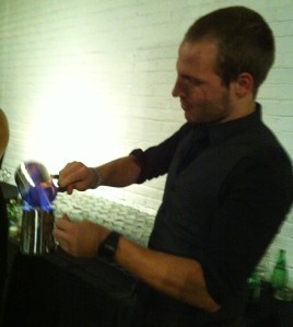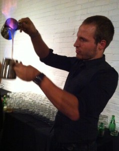 Jonathan réalisait un Blazer à base de Rhum Appleton Estate VX, de sirop de gingembre et de poivre de la Jamaïque fait maison, de bitter à l’orange et d’Angostura. Une fois cette préparation chauffée, il faut donc réaliser le fameux Blazer….