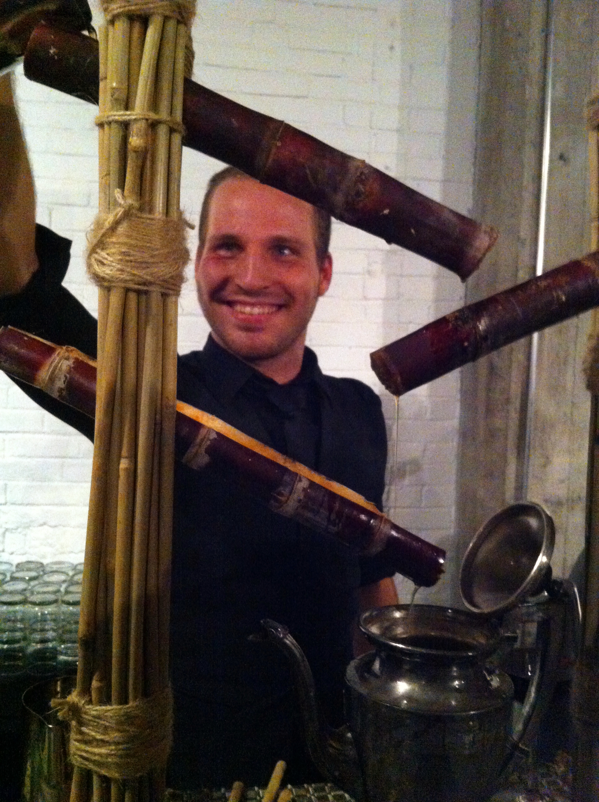 Une fois donc son blazer terminé, Jonathan le fait couler dans sa fameuse structure faite de bois et de canne à sucre. Le mélange bouillant passe dans la canne à sucre ce qui a pour but d’aromatiser et de caraméliser le mélange.