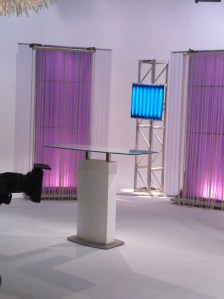 En arrivant je fais la rencontre de la recherchiste Catherine – c’est toujours plaisant de mettre un visage sur un nom et une voix – elle me conduit aussitôt sur le plateau. Ça fait toujours bizarre de découvrir un plateau de télé avant un tournage, c’est calme et puis un peut avant je : » Dans 5, 4, 3,2 », il y a un effervescence qui se ressent, avec les essais de prises de sons, les micros…