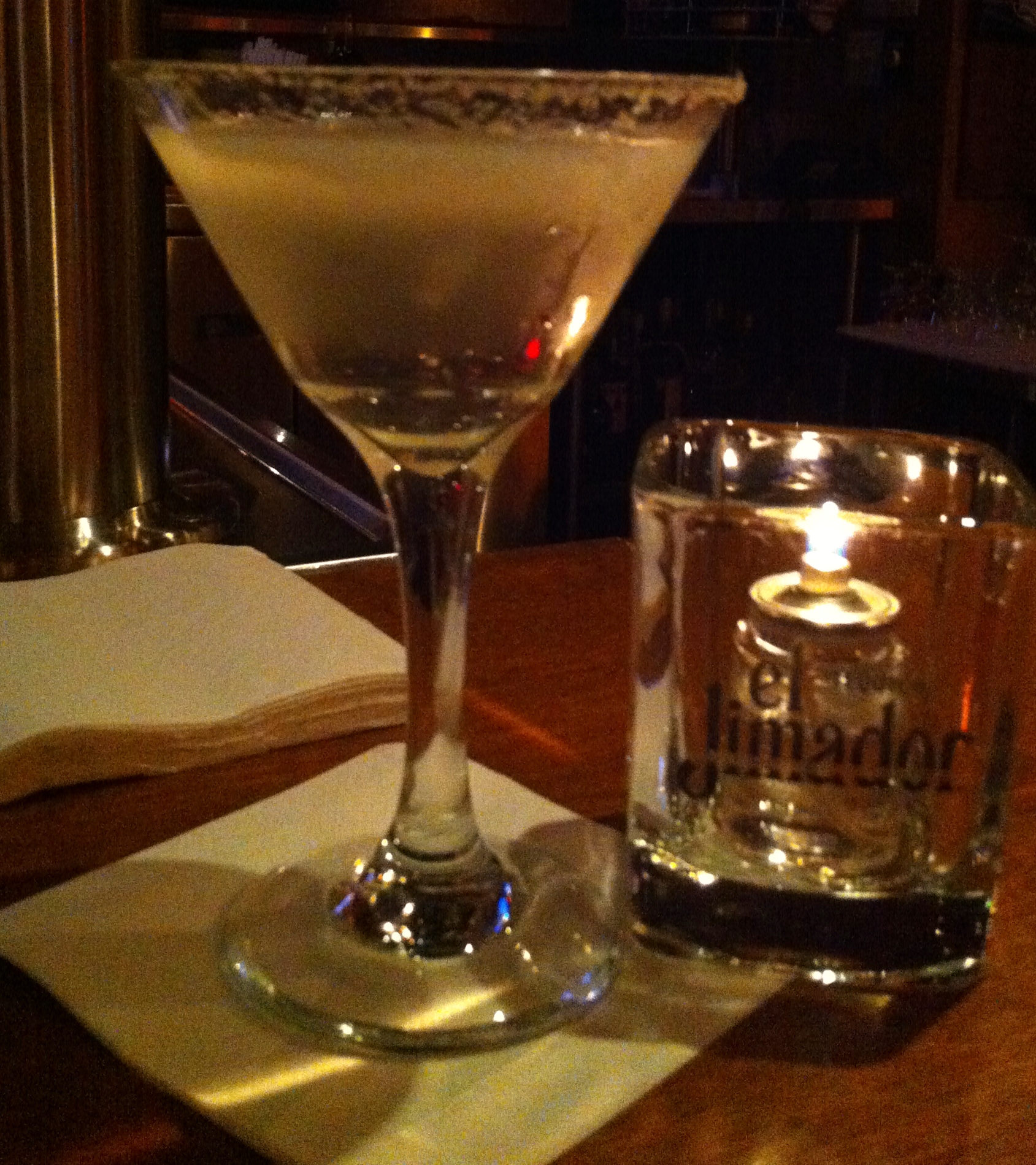 Voici maintenant le moment de la dégustation… effectivement, je m’y attendais un peu, mais le fait d’avoir les morceaux d’Aloès Verra et la pulpe des lime dans mon cocktail n’est franchement pas agréable en bouche… j’ai l’impression de boire et de manger en même temps ! En plus la barmaid m’a fait un givrage de sel sur le bord de mon verre, et perso je trouve que le côté salé avec la douceur de l’Aloès verra ne vont pas du tout ensemble ! De plus je ne sens pas trop le goût ni de la tequila El Jimador et encore moins de la Patron Citronge…. Je suis déçue 😦
