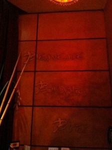 En rentrant, on découvre un endroit très zen et super reposant avec de grands abat-jours en bois flotté au dessus du bar et un grand bar qui domine dans la salle. Et que dire de cette immense cheminée, et de ce mélange de brique, bois, acier… C’est vraiment un endroit très urbain et contemporain. Et ce mur dès l’entrée sur lequel est inscrit : » Bienvenue au Boudoir », quel accueil !!!