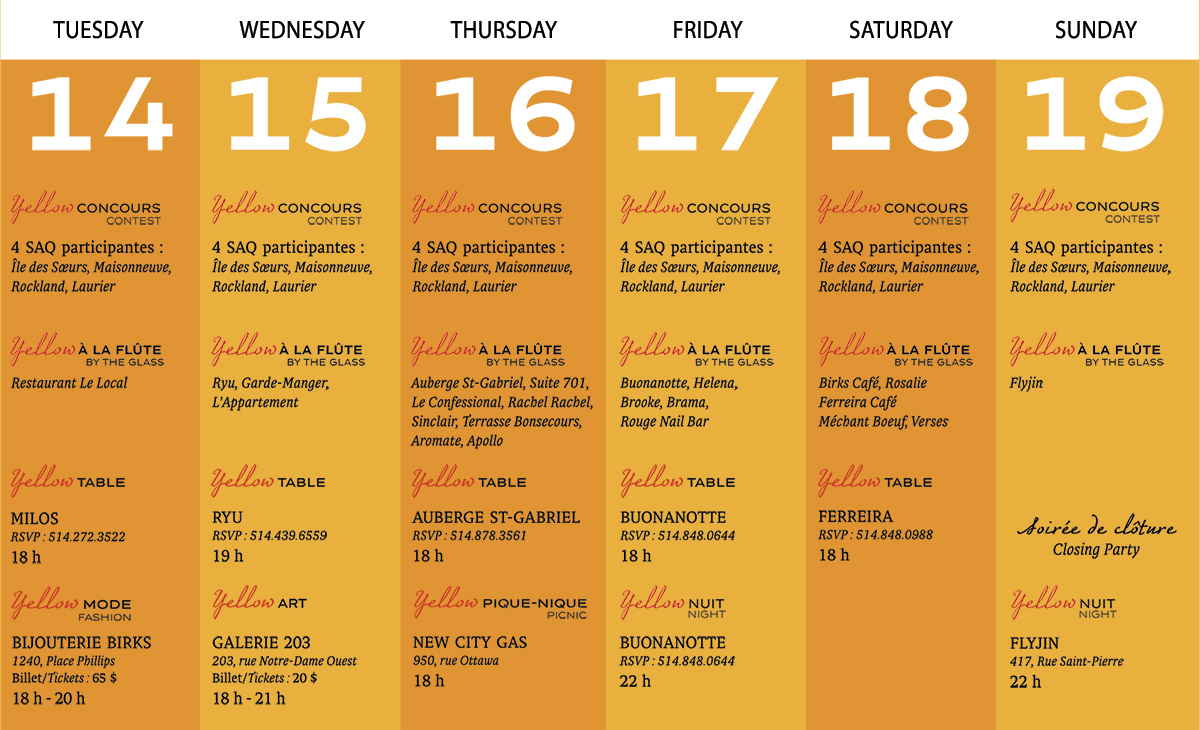 Yellow à la Flûte : Les restaurateurs partenaires auront le plaisir de vous offrir une flûte de Veuve Clicquot pour une commandée, pendant les 5 à 7 Yellow à la flûte……Vous pouvez aller sur le site www.semaineyelloweek.com pour avoir la liste de tous les endroits participants !