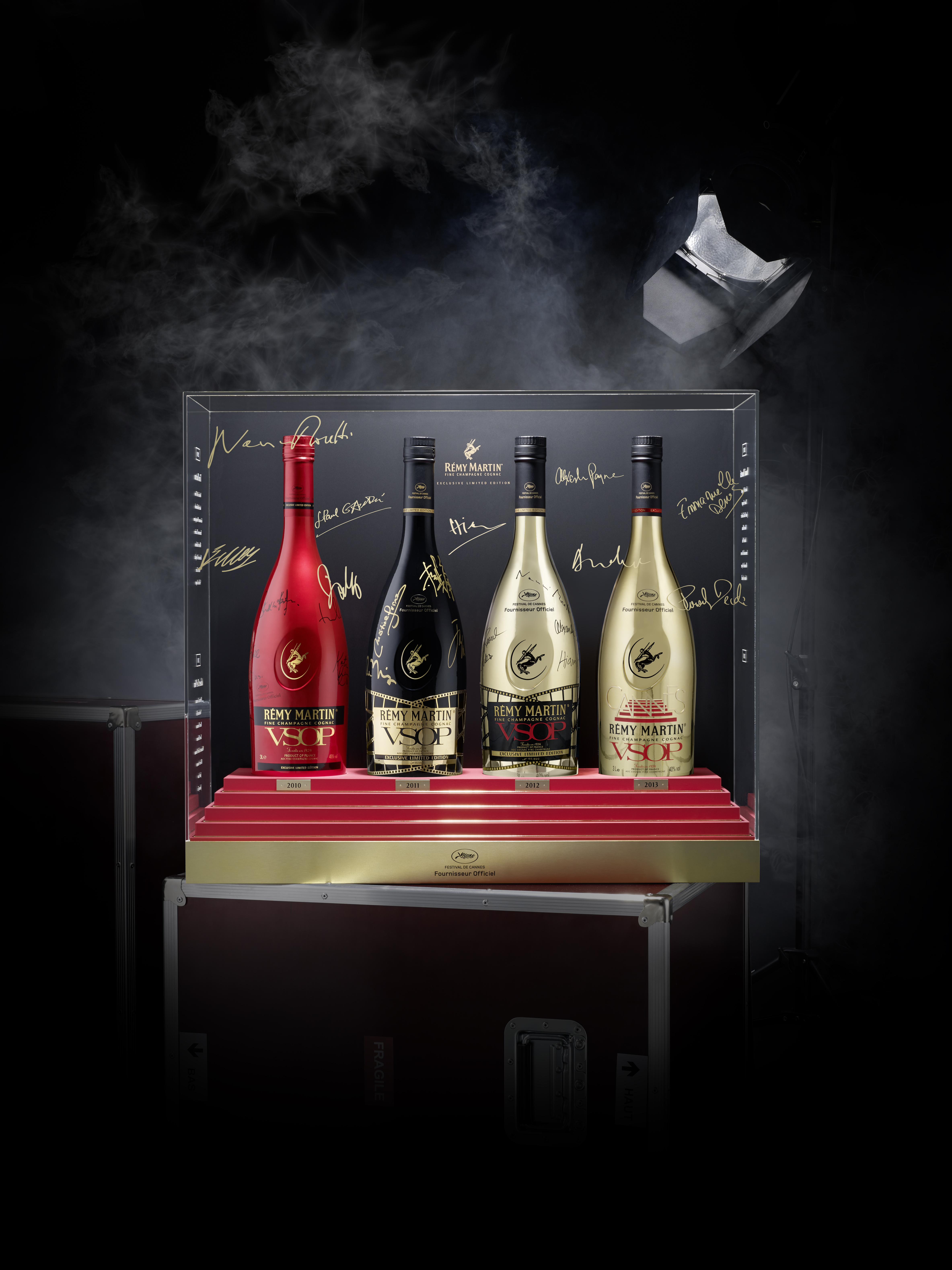 Depuis déjà plusieurs années maintenant, Rémy Martin est le fournisseur officiel du festival. Et pour l’occasion, un flaconnage en édition limitée a vu le jour. La bouteille de Cognac VSOP, entièrement dorée, fait bien sûr référence à la palme d’or, ainsi qu’aux célèbres marches.