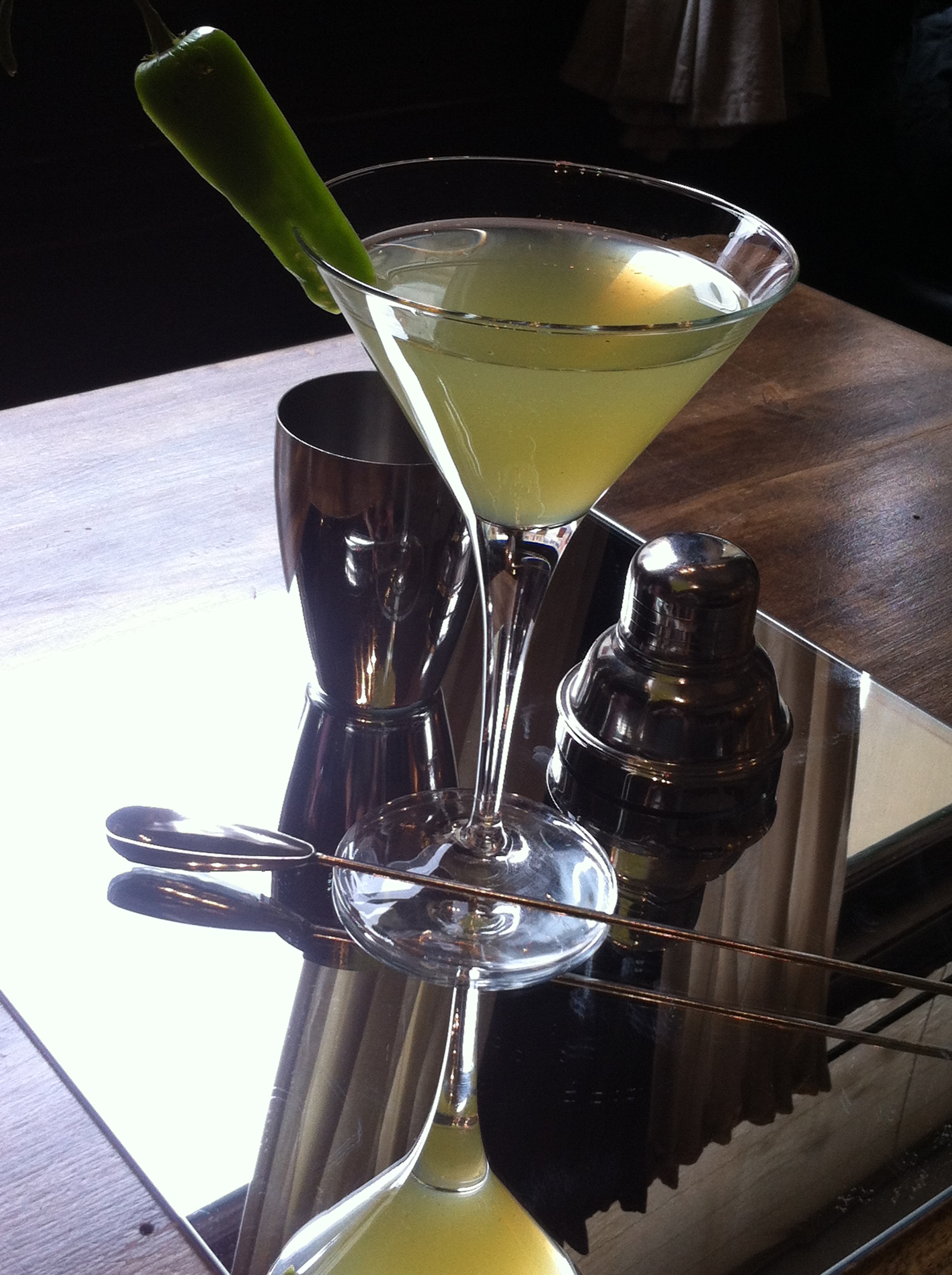 Dans un shaker, pilez les morceaux de piment jalapeno avec le jus de citron vert et le sucre de canne liquide. Puis verser les autres ingrédients. Mettre la glace et shaker énergiquement pendant 8 à 10 secondes. Filtrez dans un verre à cocktail.
