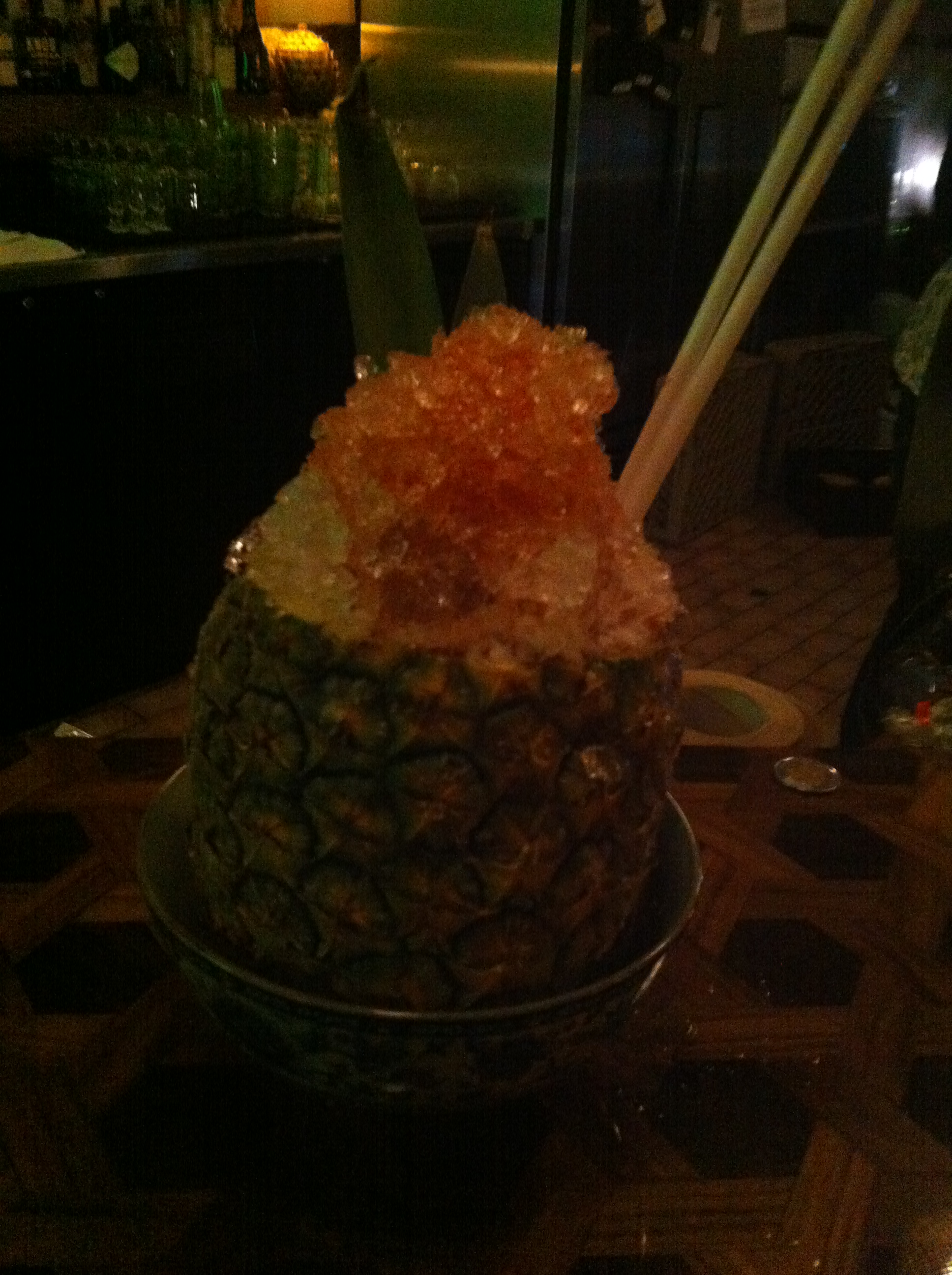 Nos cocktails arrivent et là je sors un Wow et un double Wow….. Comment vous dire, le cocktail de Max est servi dans un immense verre avec de la paille. Quant à mon cocktail moi j’adore ça quand on me sert un cocktail exotique dans un ananas…so tipico …. Je capote !!!!!
