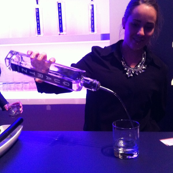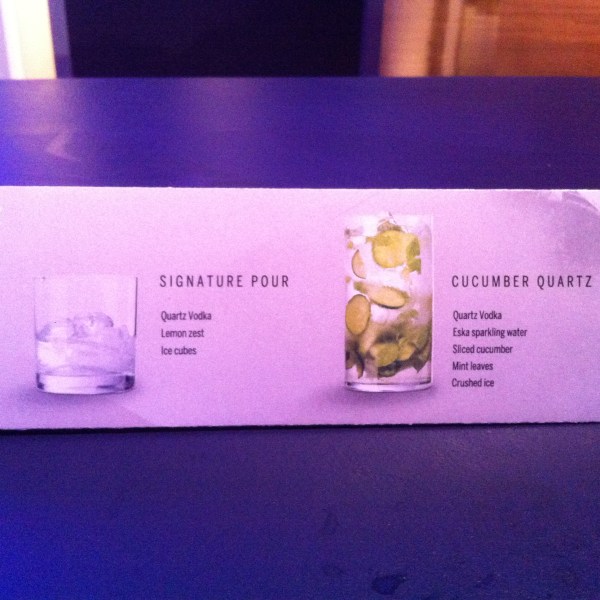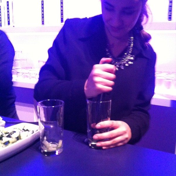 Hier soir lors du lancement, nous pouvions déguster la Vodka Quartz de différentes manières…J’étais servie par Marie-Ève qui tout d’abord, m’a confectionné le cocktail de la soirée, le » Quartz et Concombre » à base de morceaux de concombres, de feuilles de menthe, de Vodka Quartz et topé avec de l’eau pétillante Eska…ce cocktail était très rafraichissant et avec le monde présent cela était parfait pour commencer ma soirée….