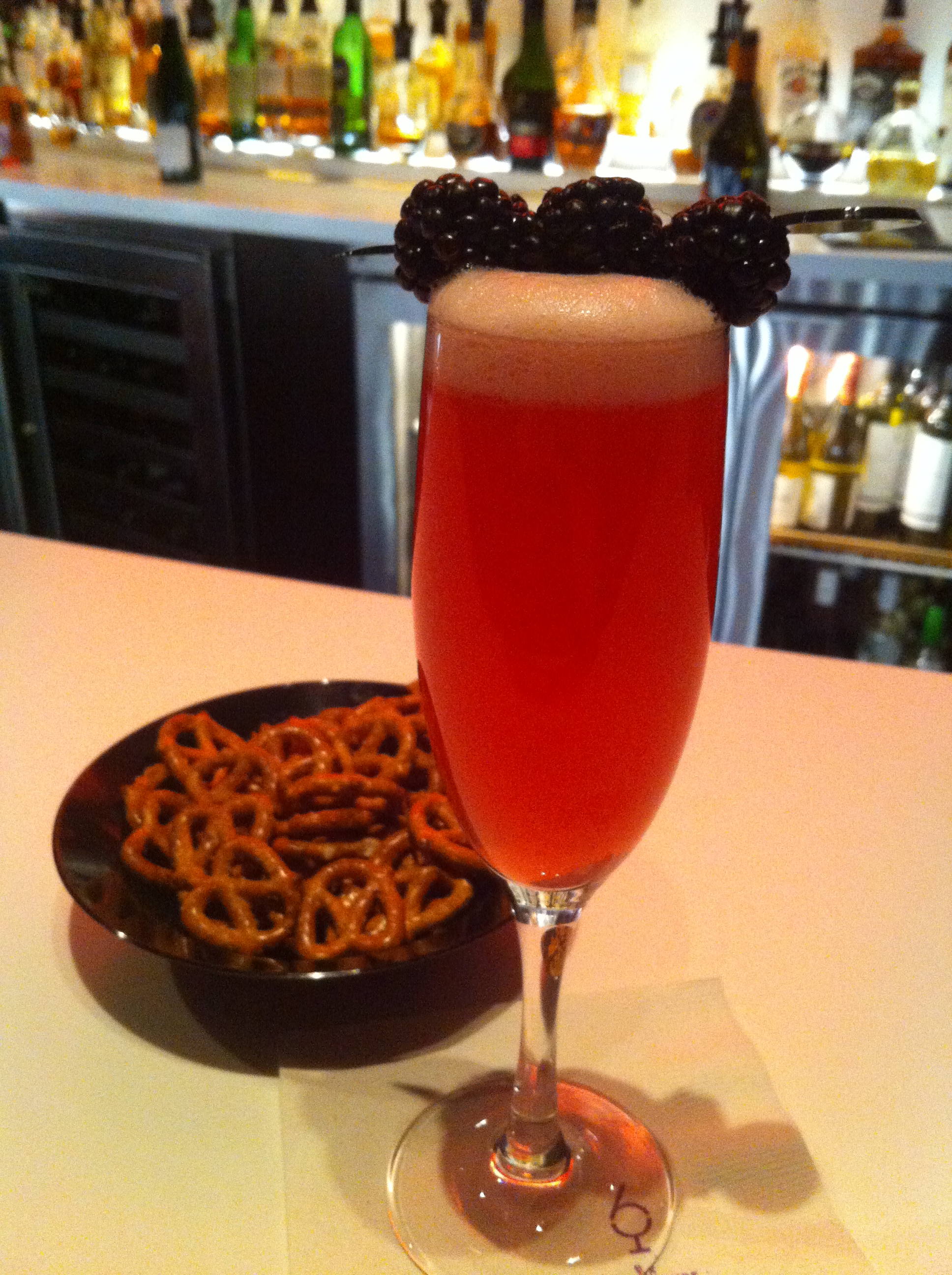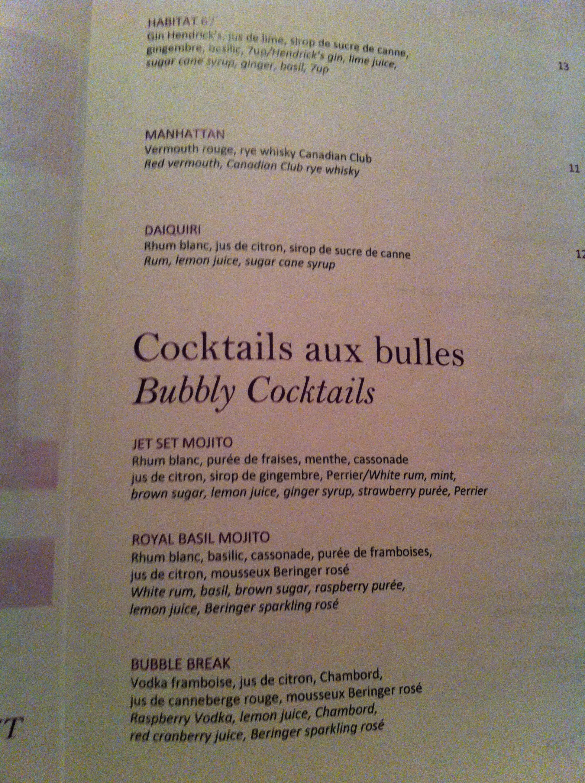 Quant à moi, je commande donc à la barmaid un Bubble Break, qui est à base de Vodka Framboise, jus de citron, Chambord, jus de canneberge blanc et Mousseux Beringer Rosé.