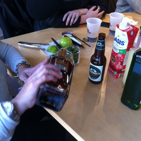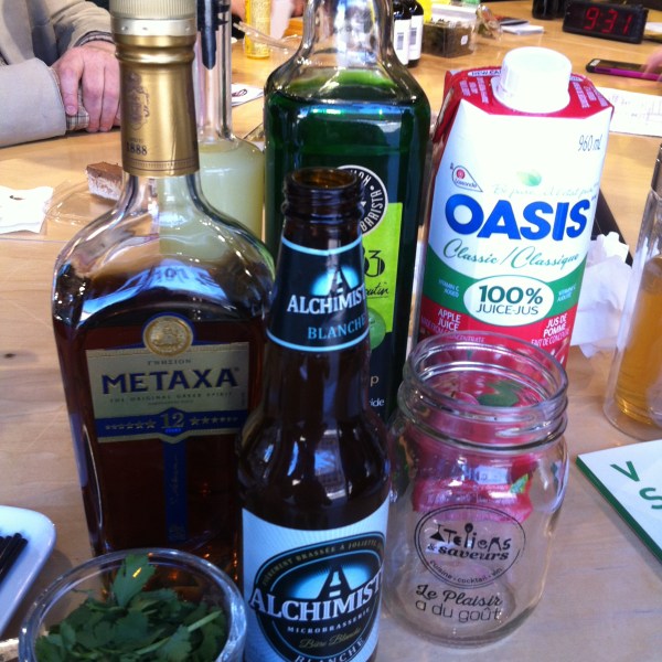 Alors j’ai créé cette sangria Hélios qui est faite à base de Metaxa 12 ans, un excellent Brandy Grec très connu, de la bière blanche Alchimiste et de la pomme …