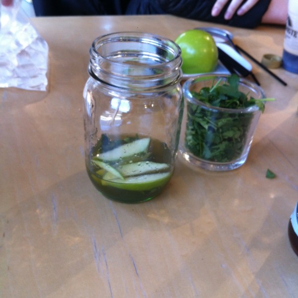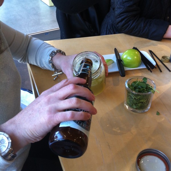 Dans un Pot Masson mettez tous les ingrédients, SAUF la bière blanche. Ajoutez de la glace et shakez énergiquement pendant 8 à 10 secondes. Complétez avec la bière blanche.