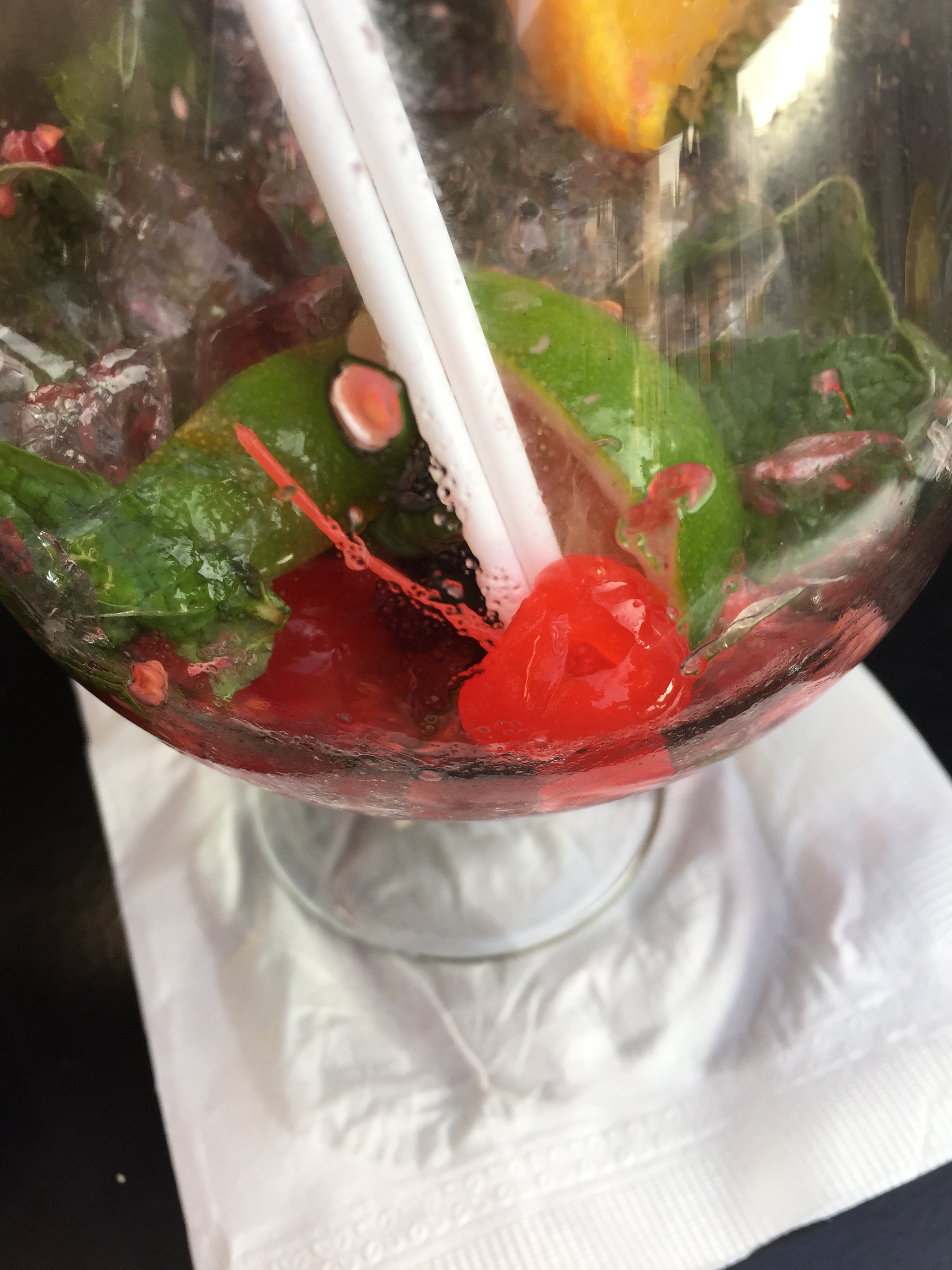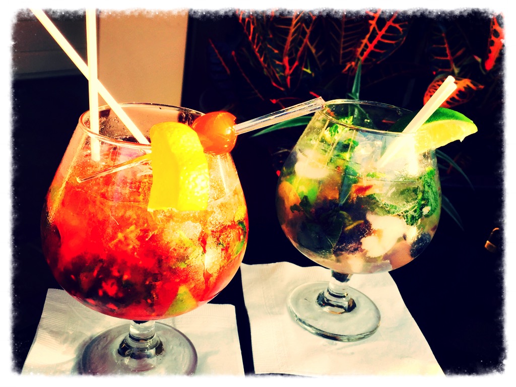 Nos Mojitos arrivent quelques minutes après notre prise de commande.… je suis étonnée de les voir servis dans des verres à digestifs !!!! Mais bon après le contenant, le contenu est hyper important aussi, non ? Le Mojito de Camille est très bien équilibré entre le sucre et l’acidulé. Le mien aussi est très bien équilibré, mon seul bémol c’est que je m’attendais à avoir des fruits frais et non pas des fruits en canne et des cerises confites !!!!
