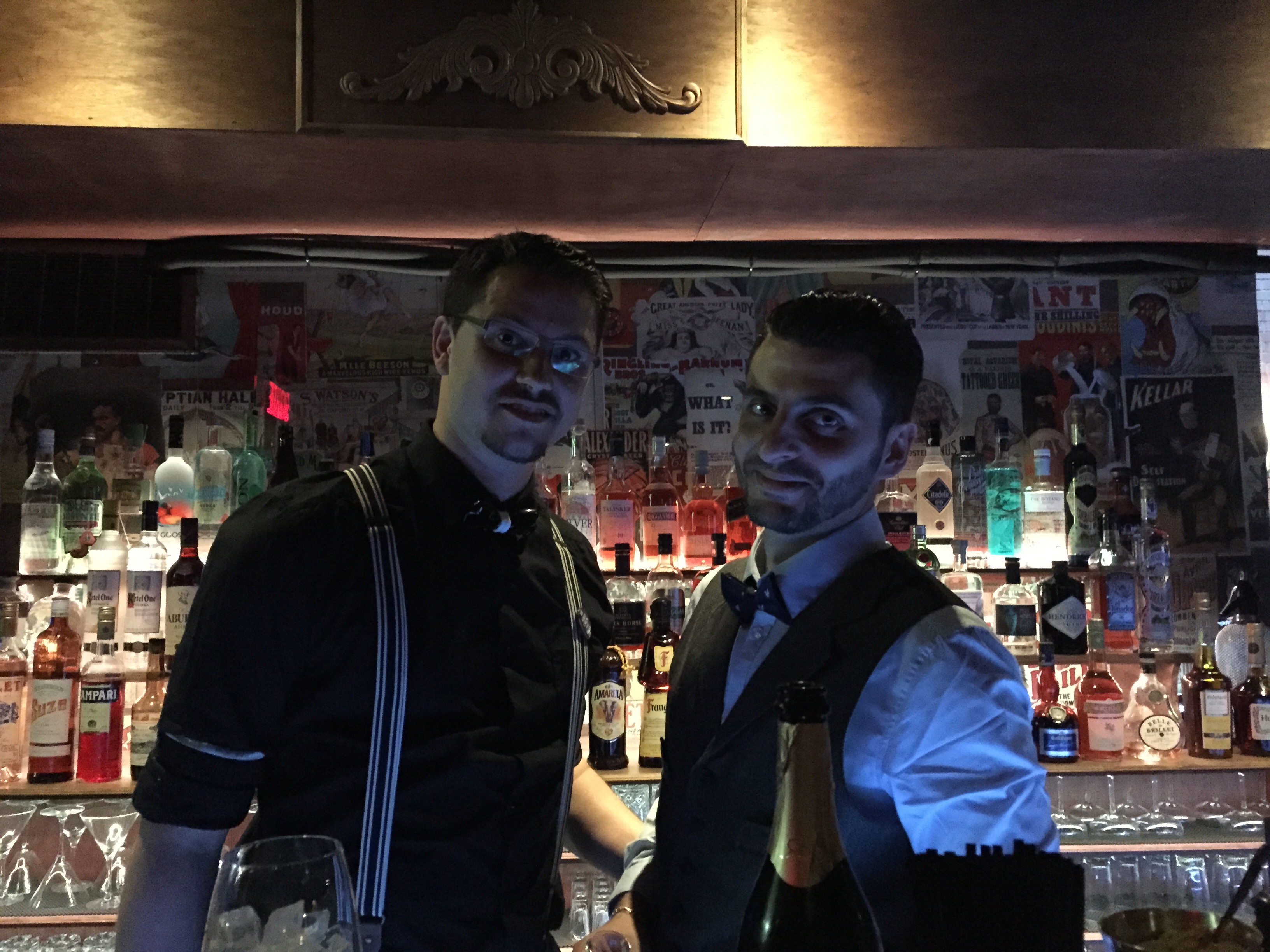 Je m’installe avec mon amie Noémie au comptoir, aussitôt, 2 des propriétaires Eddy et Romaric viennent nous saluer et nous apporter la carte des cocktails. Et là encore le souci du détail se fait ressentir. Leur tenue vestimentaire est pile poil dans la thématique, le bar est sur toute la longueur de l’établissement et va se terminer dans la 2ème salle, la verrerie est Vintage…