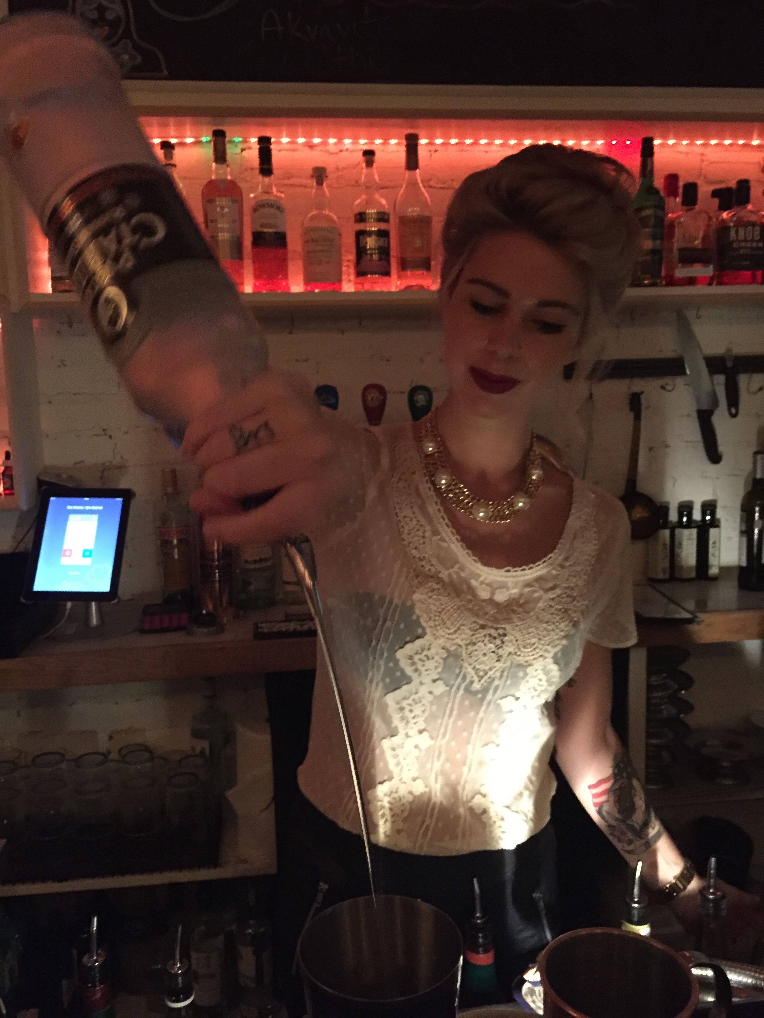 Le temps de papoter un peu avec Camille, et Fred nous a déjà confectionné nos 2 cocktails. Et là que c’est plaisant de la voir travailler, sa gestuelle est parfaite et sûre, on sent la pro travaillant derrière le bar ! C’est donc l’heure de la dégustation.