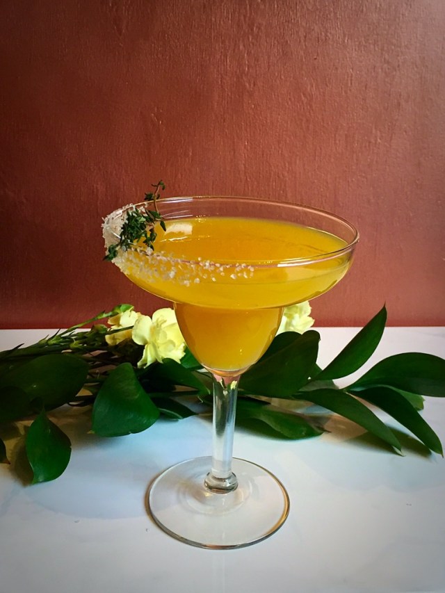 Givrez votre la moitié de votre verre à Margarita avec du sel et slappez une branche de thym que vous déposerez sur le bord.