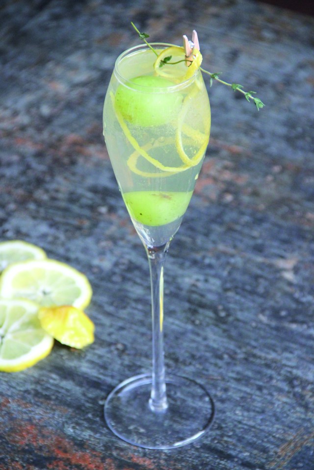 Déposez quelques raisins verts dans votre verre. Faites un zeste de citron que vous accrocherez avec une branche de thym , sur le bord de votre verre avec une pince.