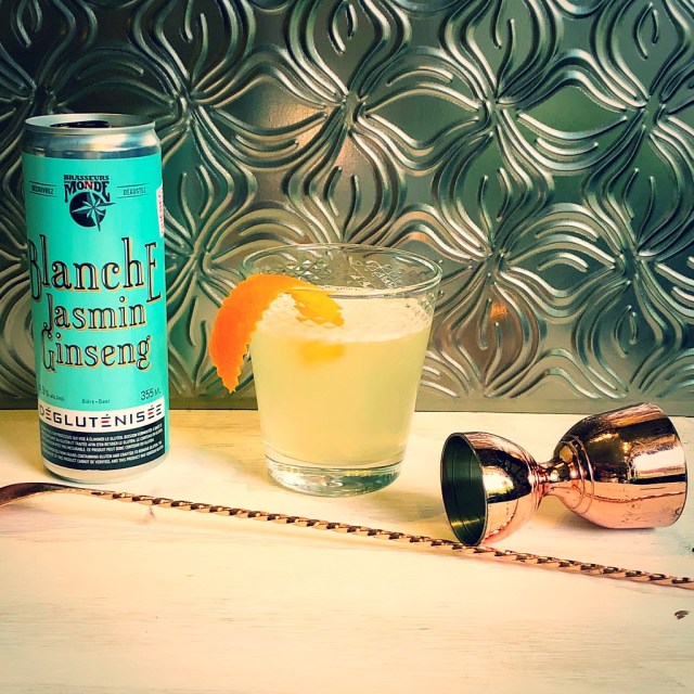 Alain J. Thibault des Brasseurs du monde était également à l’émission et il présentait sa gamme de bière déglunétisée aromatisée. Et le sachant d’avance, je me suis donc amusée à créer un cocktail avec une de ses saveurs de bière, celle aromatisée au Jasmin et Ginseng…
