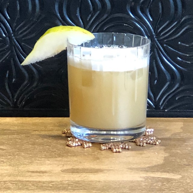 Mettez 2 gouttes de bitter au chocolat sur le dessus du verre et une tranche de poire.