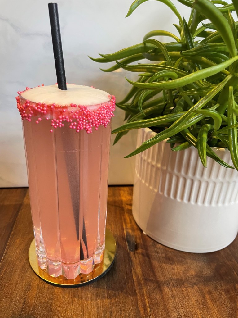 Dans un shaker, mettez le jus de citron, le sirop de licorne, le gin rose et les gouttes d’émulsifiant vegan.